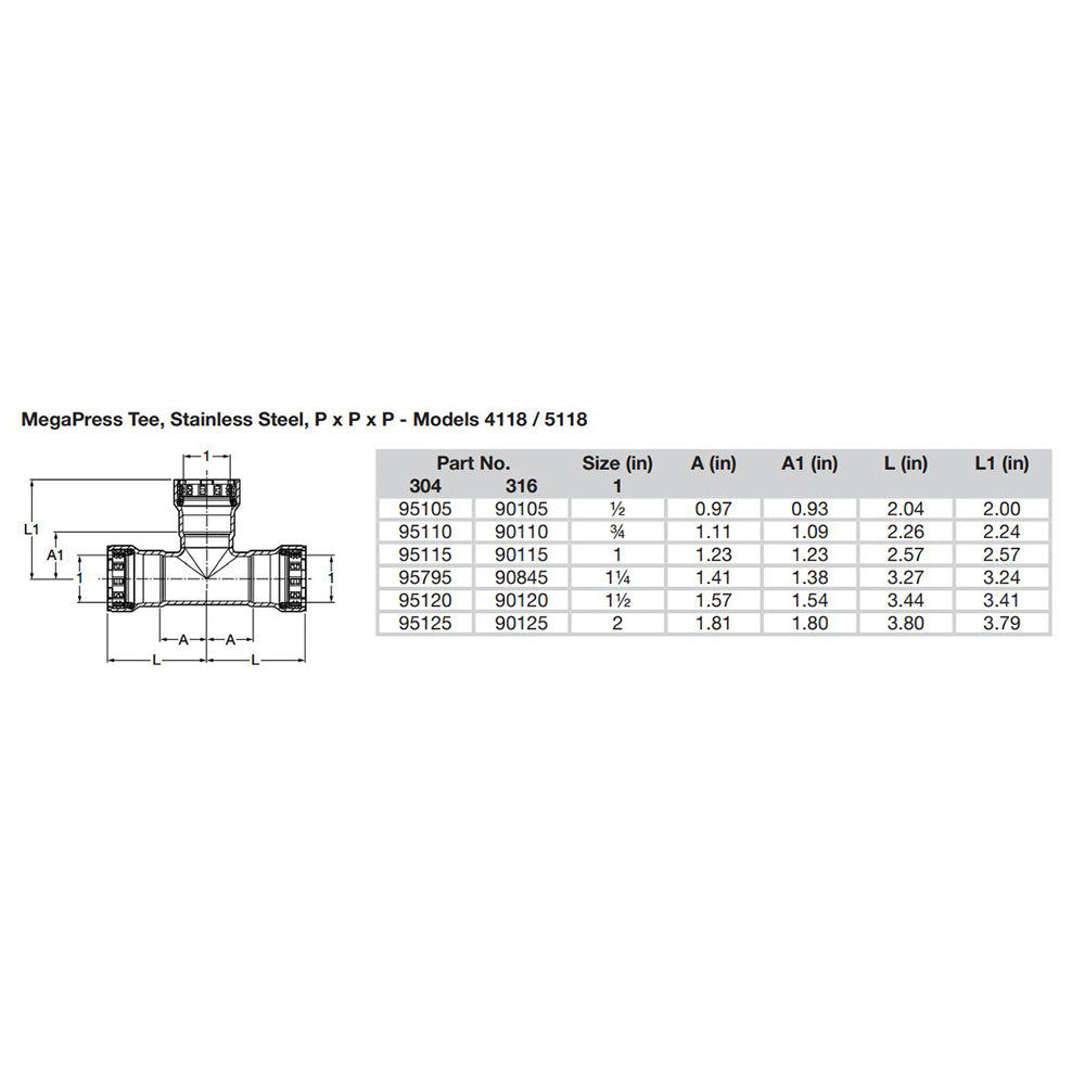 MegaPress 1" Stainless Steel 304 Tee - Triple Press Connection - Smart Connect Technology